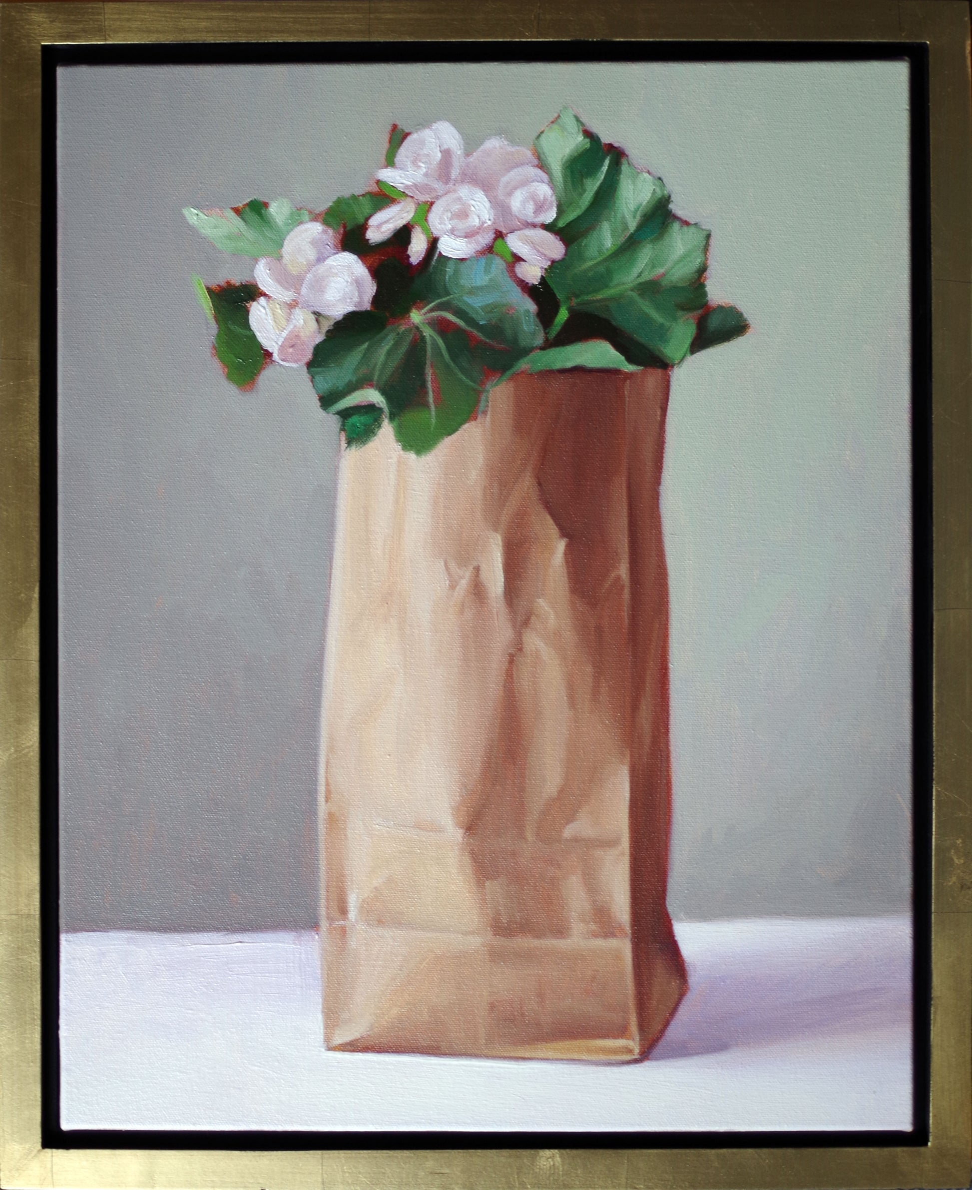 Still life painting of white begonias in a paper bag. Original oil painting on canvas by James Bursenos. 18 3/8 x 22 3/8 x 1 3/4 inches, framed. Wooden floater frame with gold leaf. Realism.